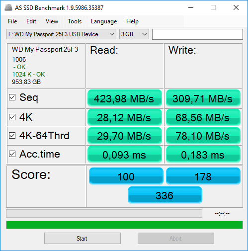 In beide gevallen geven de benchmarkprogramma’s prima scores. Het is niet de allersnelste SSD die verkrijgbaar is, maar wel sneller dan een conventionele harddisk. In het geheel gezien levert de WD MyPassport gewoon prima prestaties.