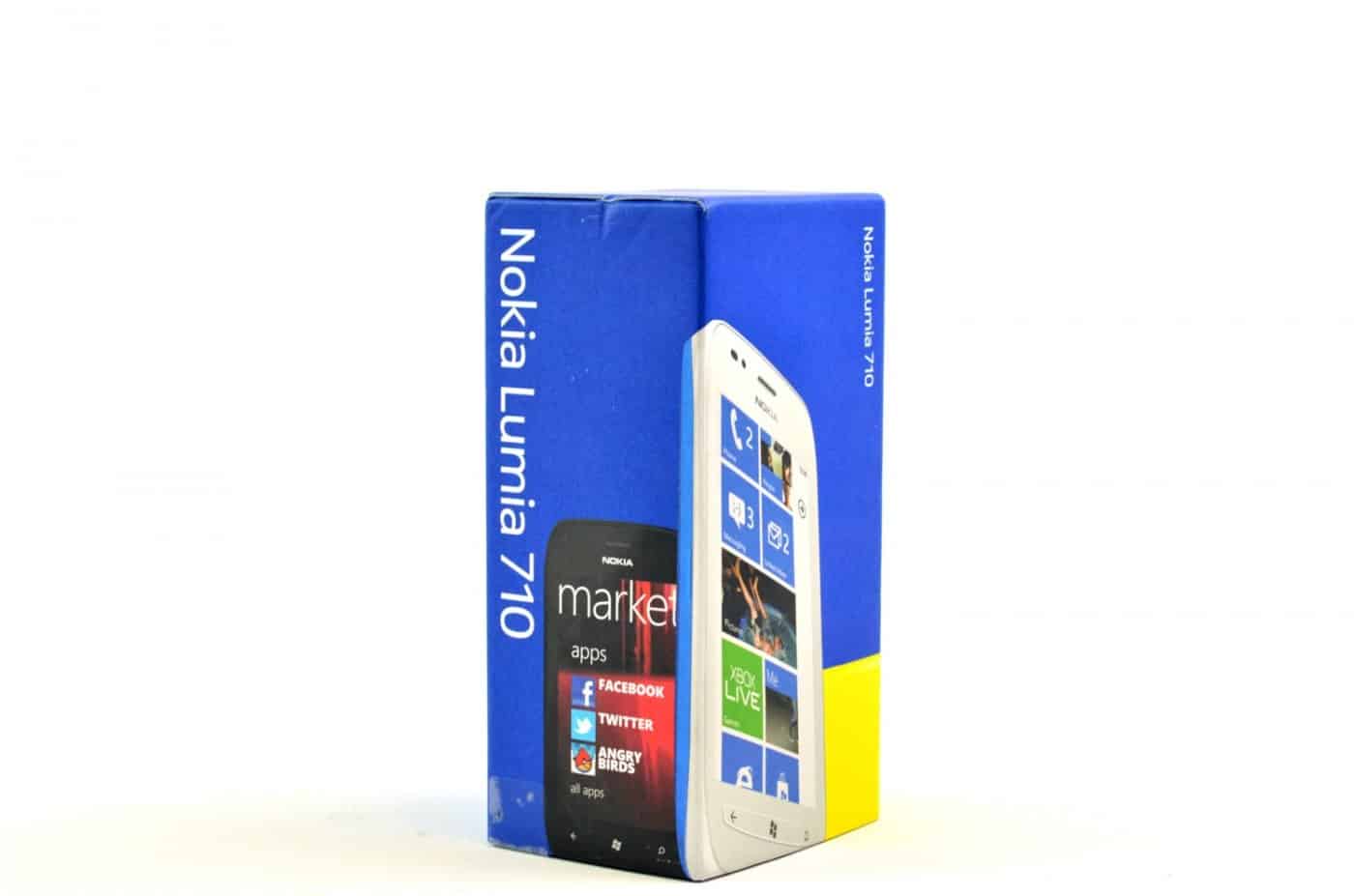 Zoals ook bij de Lumia 800 het geval was, wordt de Lumia 710 in een blauwe doos geleverd. Aan de blauwtint kunnen consumenten onmiddellijk herkennen dat het om een Nokia-product gaat. Nokia laat er geen misverstand over bestaan dat het om de Lumia 710 gaat. Allereerst vermeldt de Finse smartphonefabrikant op de zijkant met grote, witte letters dat het om dit type toestel gaat. Op de voorzijde is een afbeelding van het toestel terug te vinden waarop het hoofdscherm met de kenmerkende tiles (tegels) zijn terug te vinden van Windows Phone. Daarbij maakt de fabrikant nogmaals duidelijk dat het om de Lumia 710 gaat in combinatie met Windows Phone.