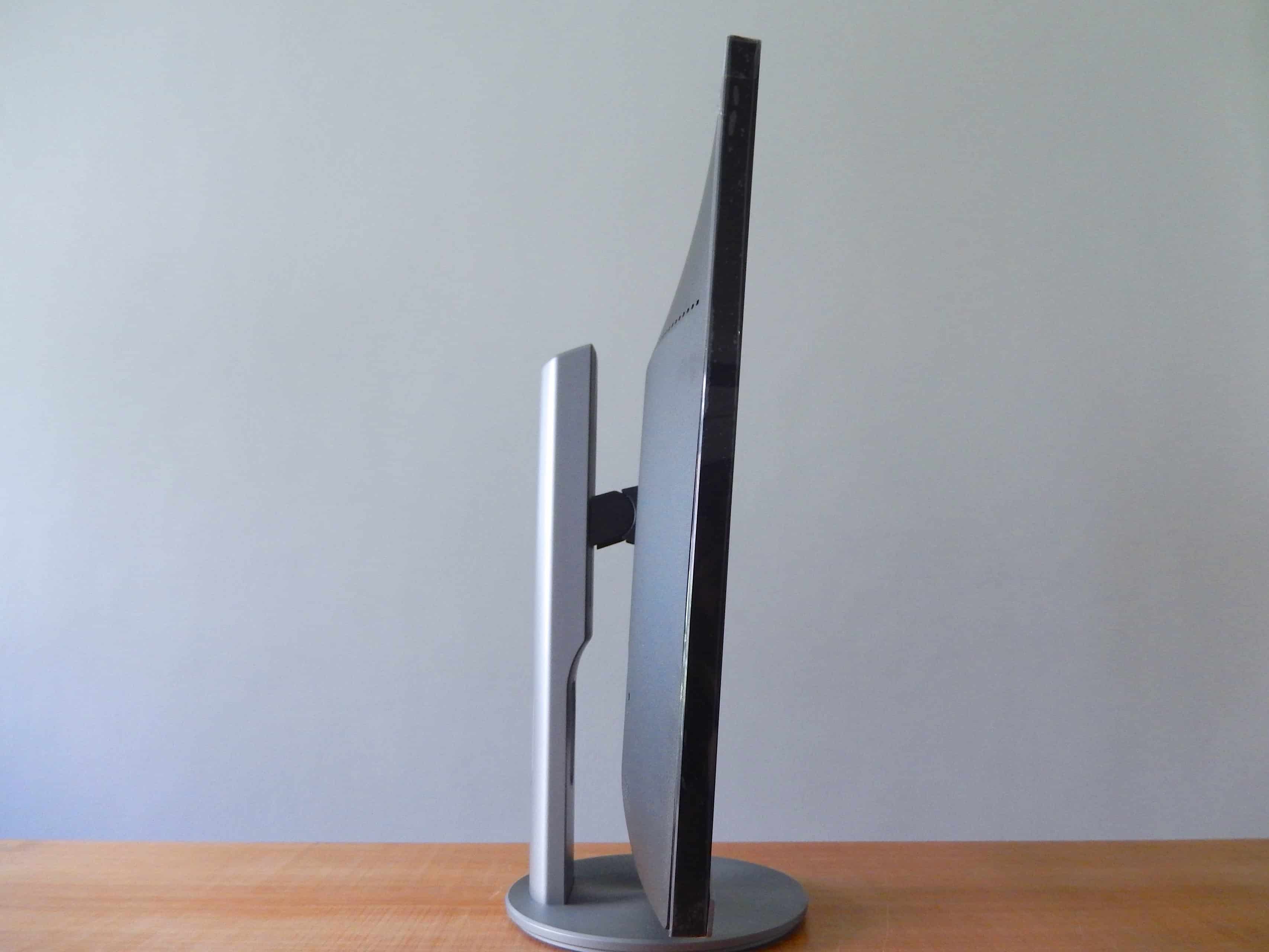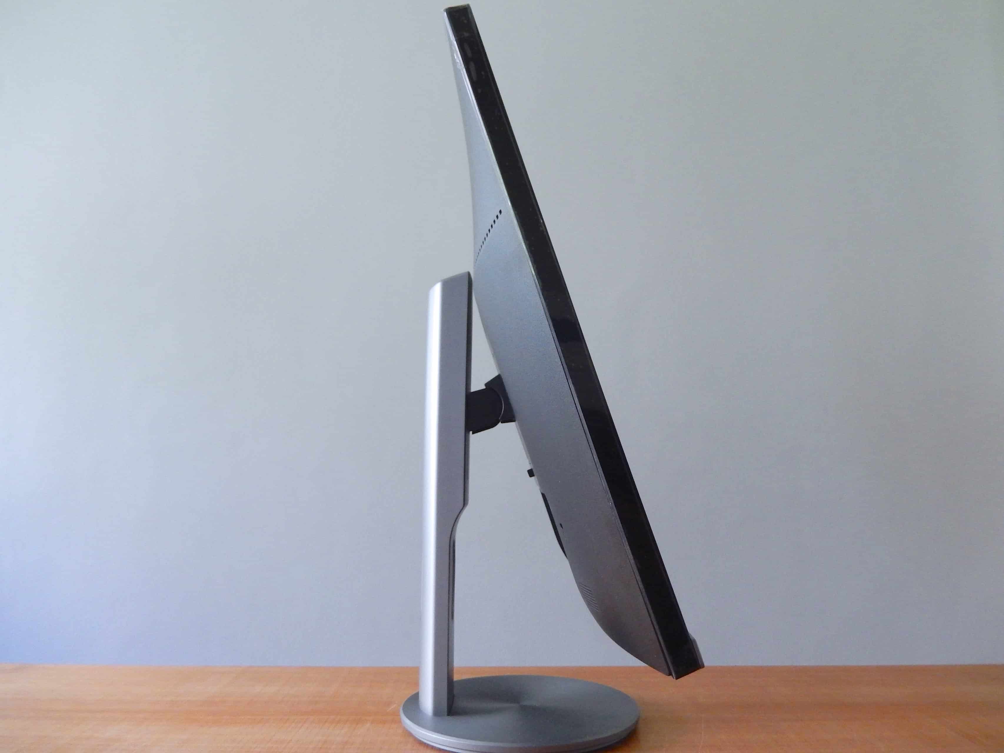 De voet is in een oogwenk en zonder gereedschap te assembleren, is voorzien van een handige kabeldoorvoer en is 90 graden om zijn as draaibaar. De monitor is, zonder dat we al te veel kracht moeten uitoefenen, netjes in hoogte verstelbaar en houdt de ingestelde positie prima vast. Ook kunnen we het scherm voldoende kantelen zodat we altijd de optimale kijkhoek kunnen instellen. Helaas kunnen we de monitor niet in portretformaat draaien.