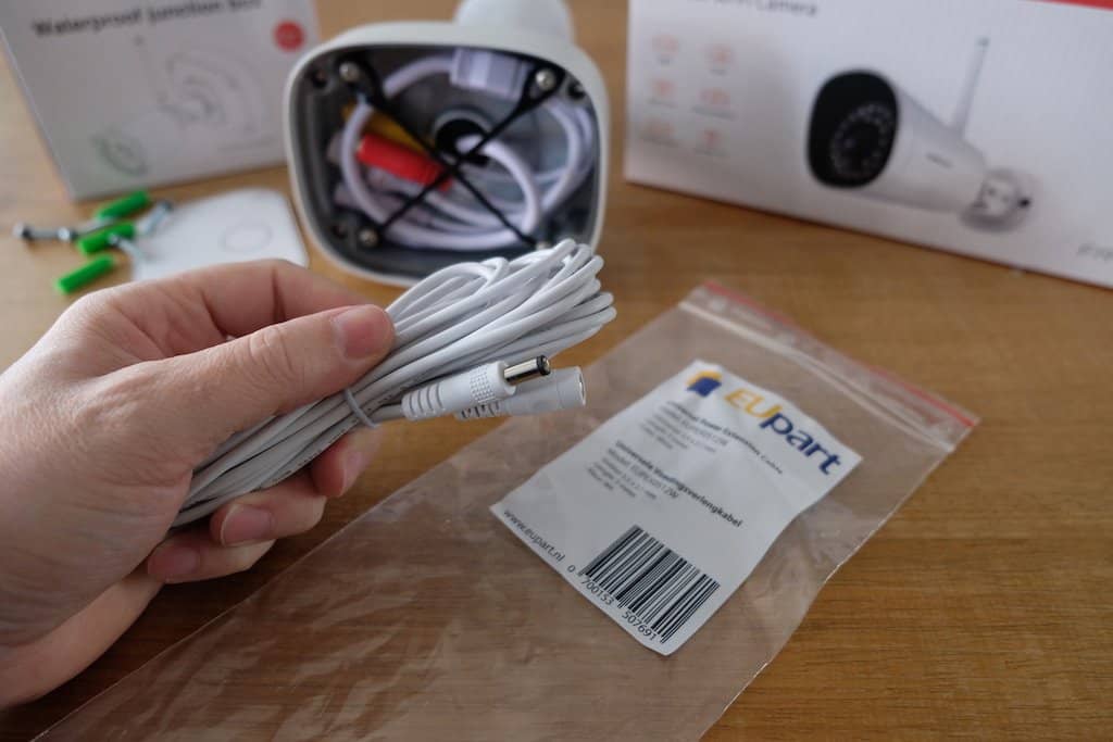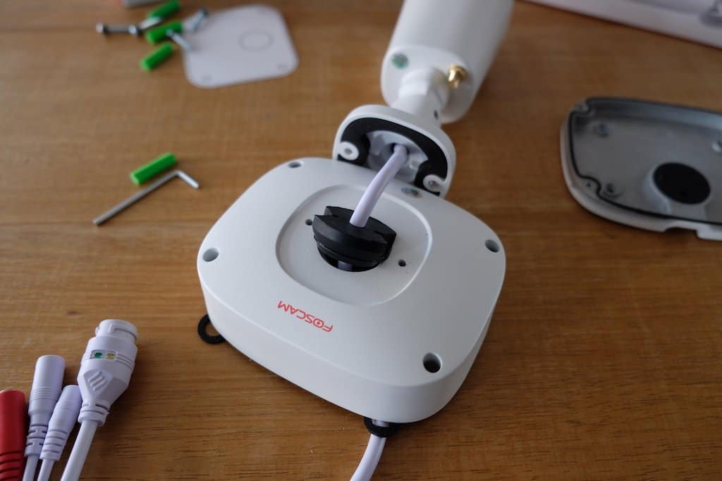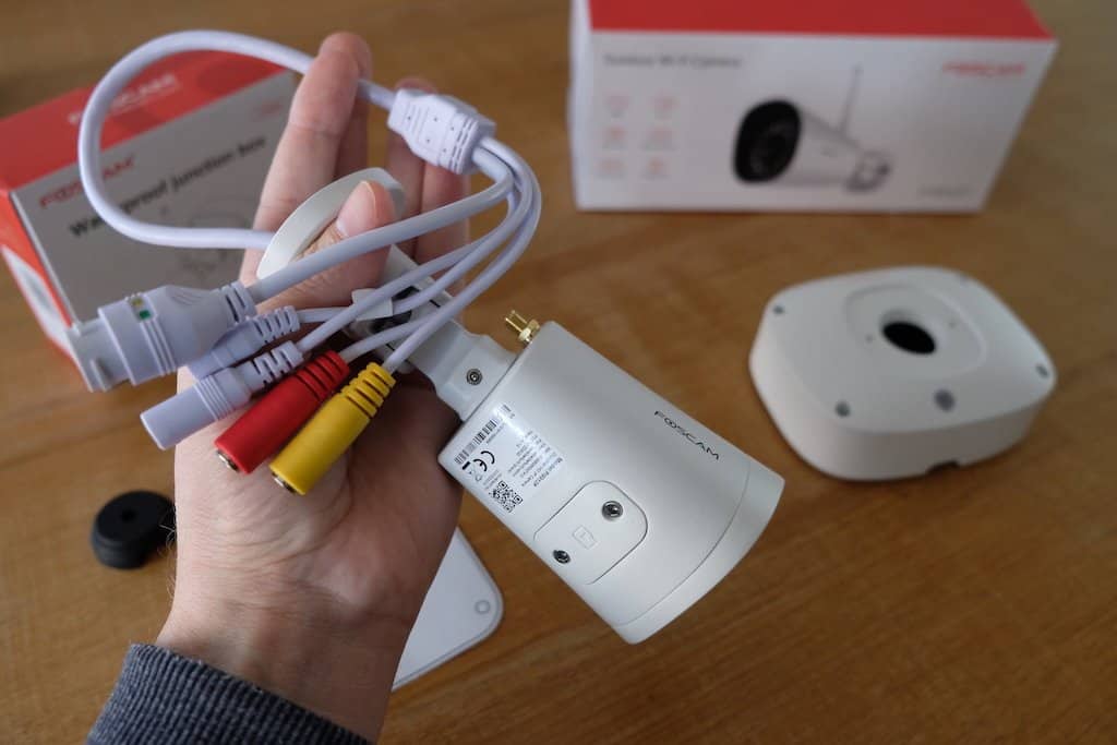 De door ons ontvangen 2MP Foscam FI9912P wifi-camera maakt een uitstekende eerste indruk. De behuizing is geheel van metaal. De voet is op drie punten (3-assen) te verstellen zodat de camera onder elke hoek kan worden geplaatst. Nu valt het ons wel op dat deze camera een flinke bos met kabels heeft. Een kabel met een reset-knop, een composiet video uit, audio uit, RJ45 netwerk en de stroomvoorziening. Hoe gaan we dit in hemelsnaam allemaal wegwerken?