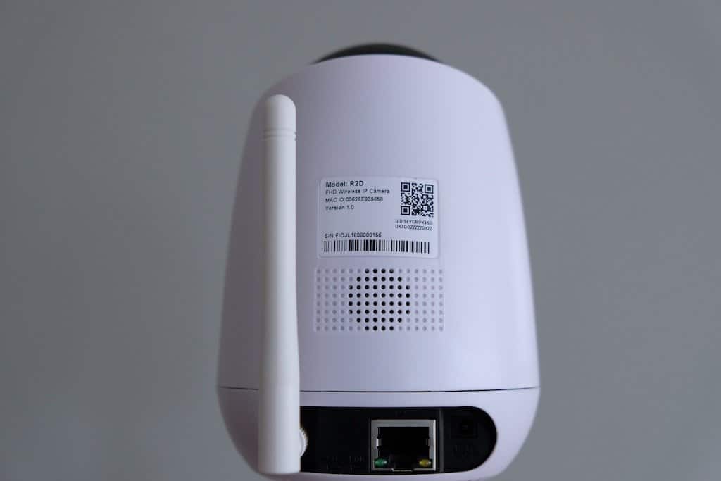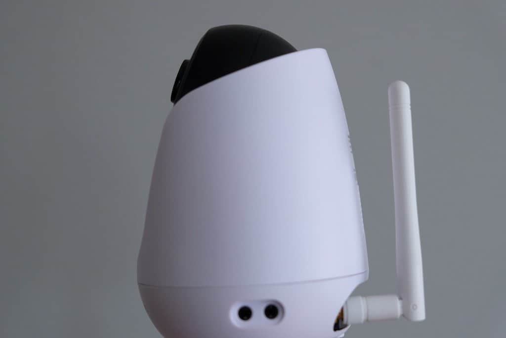 Aan de achterzijde van links naar rechts vinden we de bevestiging voor de wifi-antenne, twee status LED’s, een RJ45 netwerkaansluiting en de aansluiting voor de netspanningsadapter. Midden achterop onder de typeaanduiding de QR-code voor een snelle aanmelding en een kleine luidspreker voor 2-weg communicatie. Aan de linker zijkant heeft de Foscam R2D een microSD-slot voor een additionele microSD-kaart waarop de opgenomen beelden keurig (als back-up) worden opgeslagen.