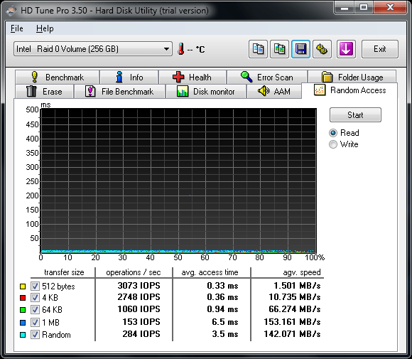 Ook de accesstime neemt iets toe wanneer er twee schijven gecombineerd worden. Zetten we de accesstime af tegen een gewone harde schijf dan is dat nog steeds enorm lage (en een niet tot nauwelijks merkbare) score.