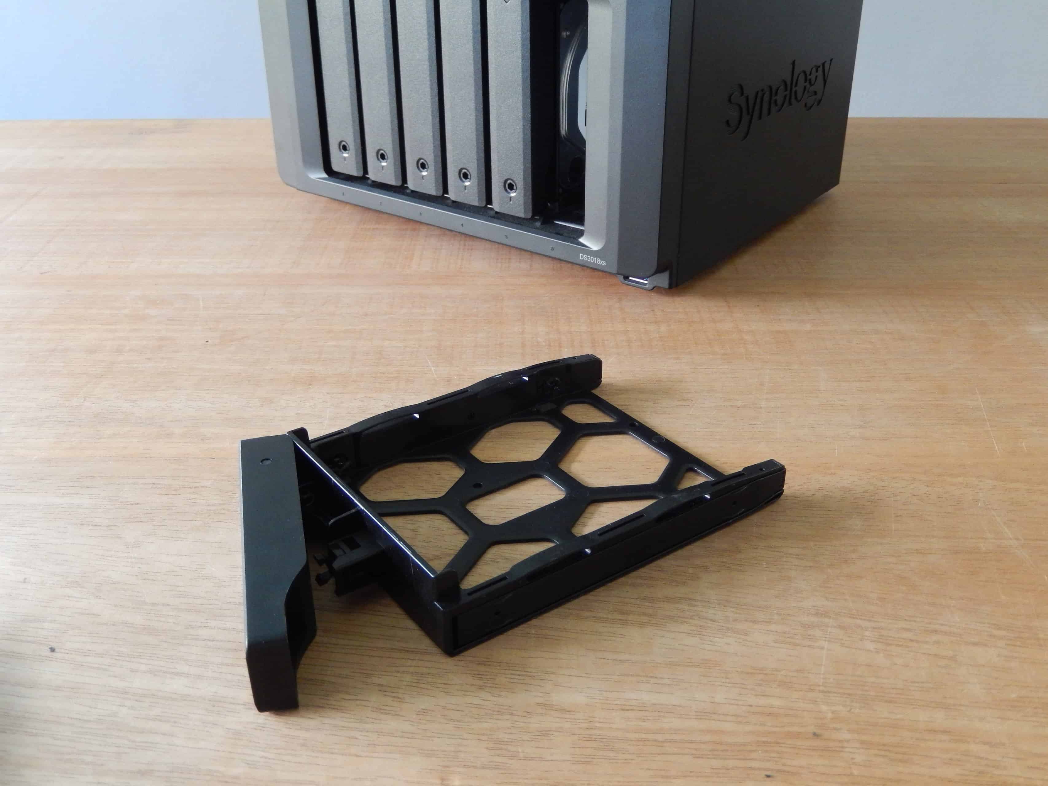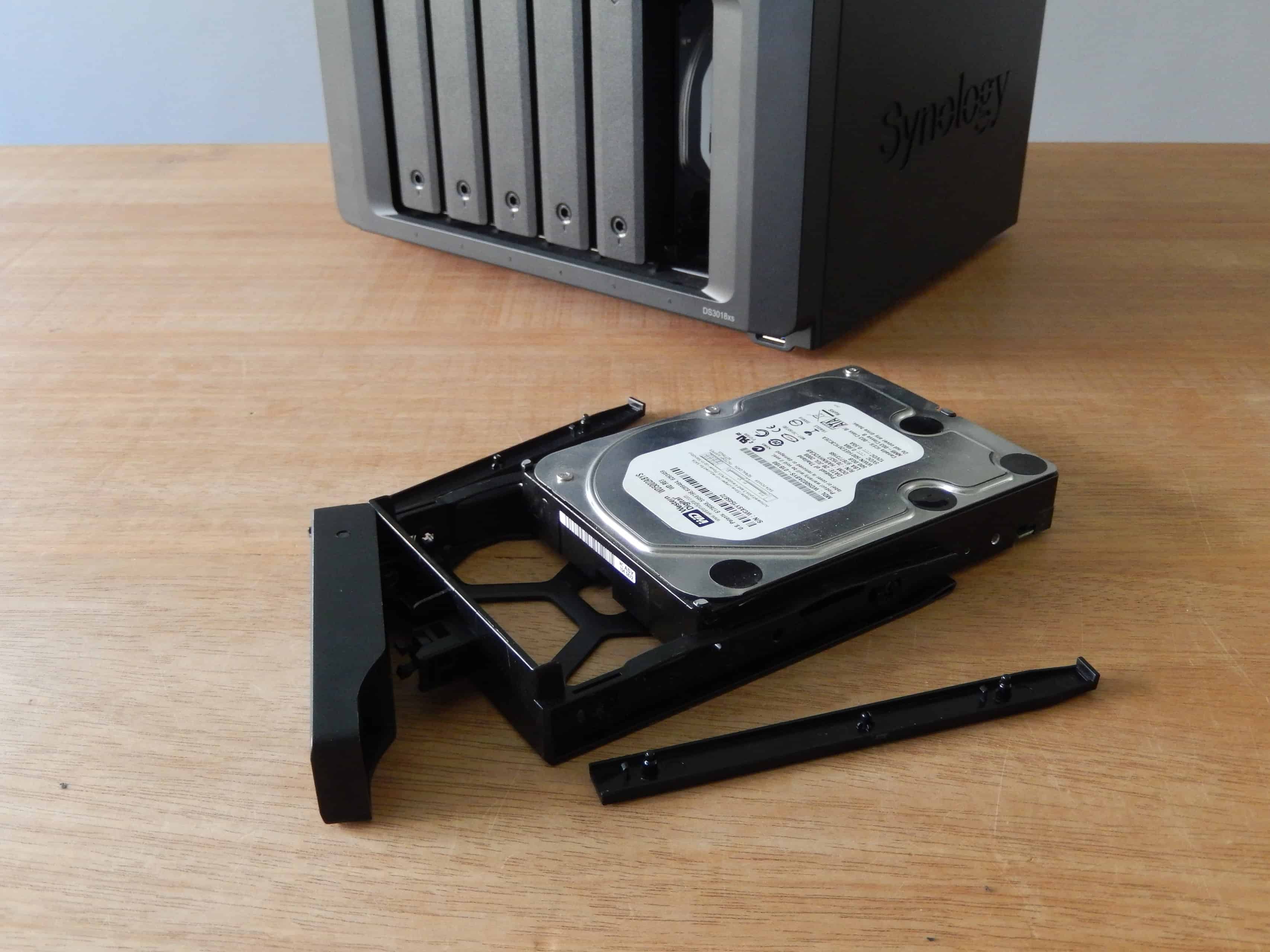 Vervolgens in omgekeerde volgorde een verse drive plaatsen, insteken en de drivebay weer vergrendelen. Dit klusje neemt nog geen minuut in beslag. Het DSM verzorgt vervolgens geheel automatisch de datadistributie zodat de NAS in enkele uren tijd weer veilig in RAID configuratie doordraait.