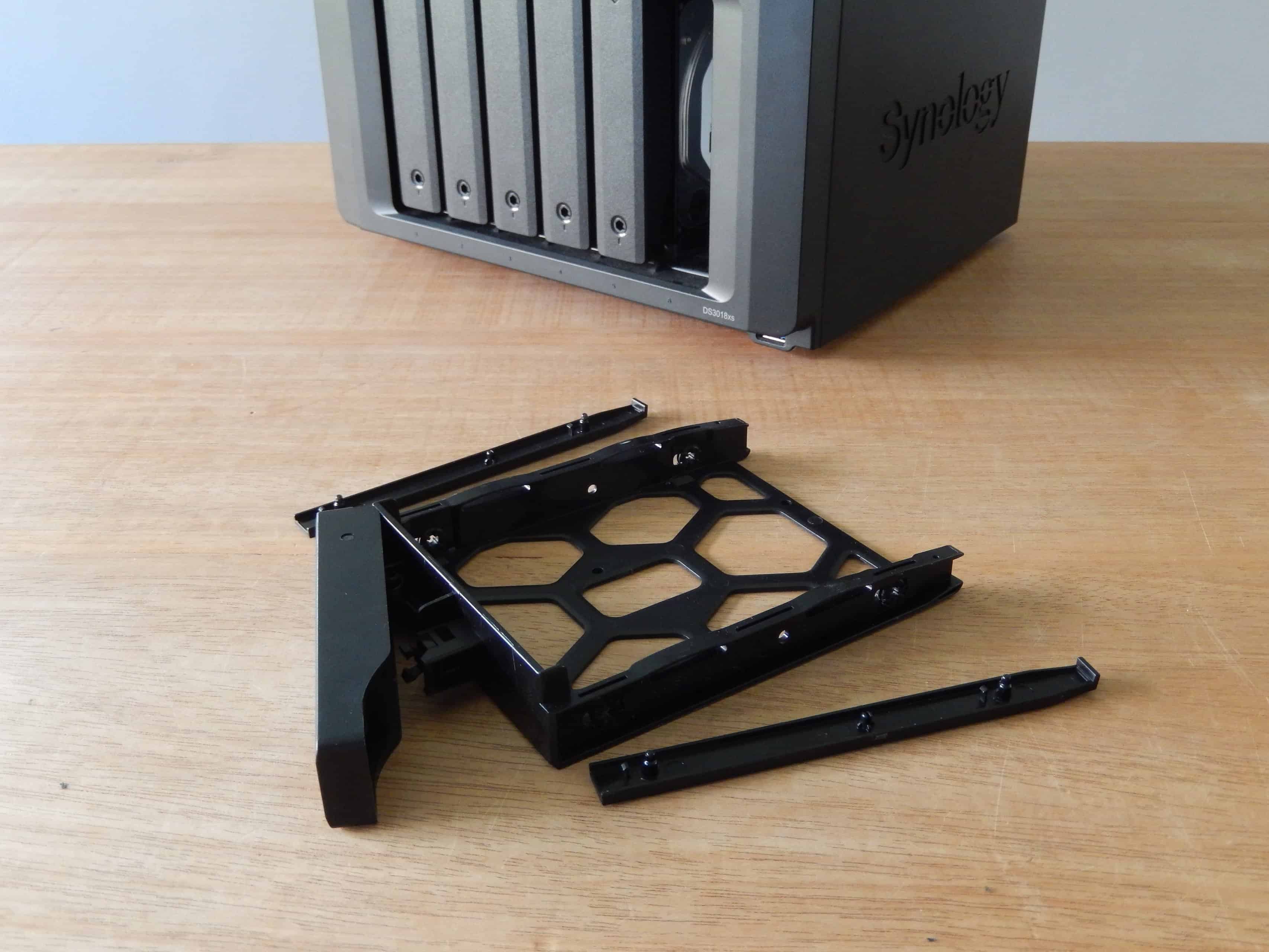 Hiervoor is, naast de sleutel, geen speciaal gereedschap nodig. Bij het lichtjes drukken op de onderste helft van het klepje veert de corresponderende drivebay open. De drivebay is nu ontgrendeld en kan uit de NAS worden getrokken. Nu is het een kwestie de twee plastic strips aan beide zijden los te klikken, waarna de harddisk uit de tray kan worden genomen.