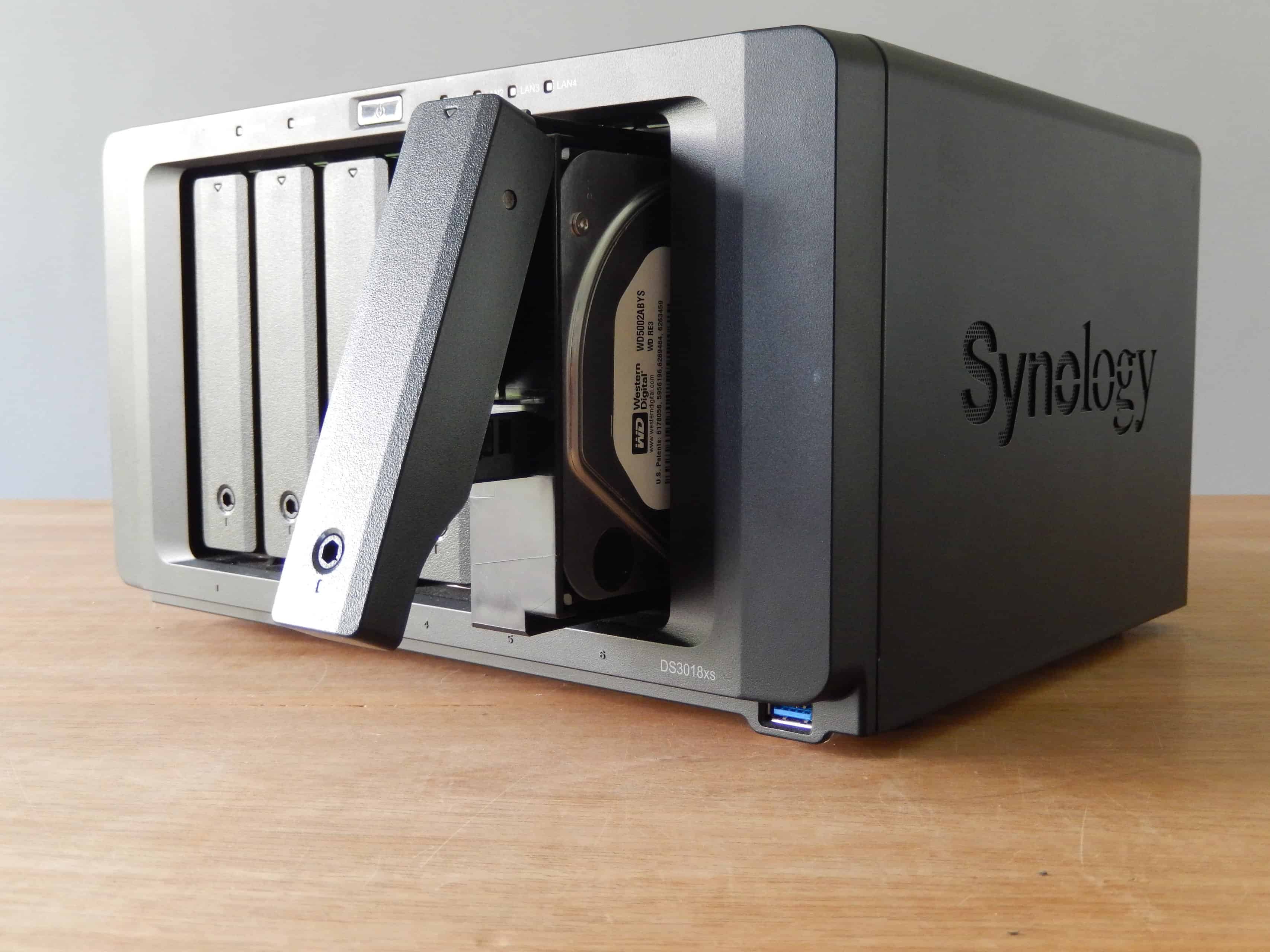 Het plaatsen van een nieuwe harddisk of het vervangen van een defect exemplaar is kinderspel bij Synology. Hiervoor heeft Synology de drivebays van haar ‘professionele’ NAS-lijn aan de voorzijde geplaatst, zodat deze drives in een oogwenk kunnen worden benaderd en de NAS onaangeroerd kan blijven staan. Naar wens kunnen deze drivebays worden vergrendeld met een speciale meegeleverde sleutel. Zodoende kunnen onbevoegden niet zomaar een harddisk uitnemen.