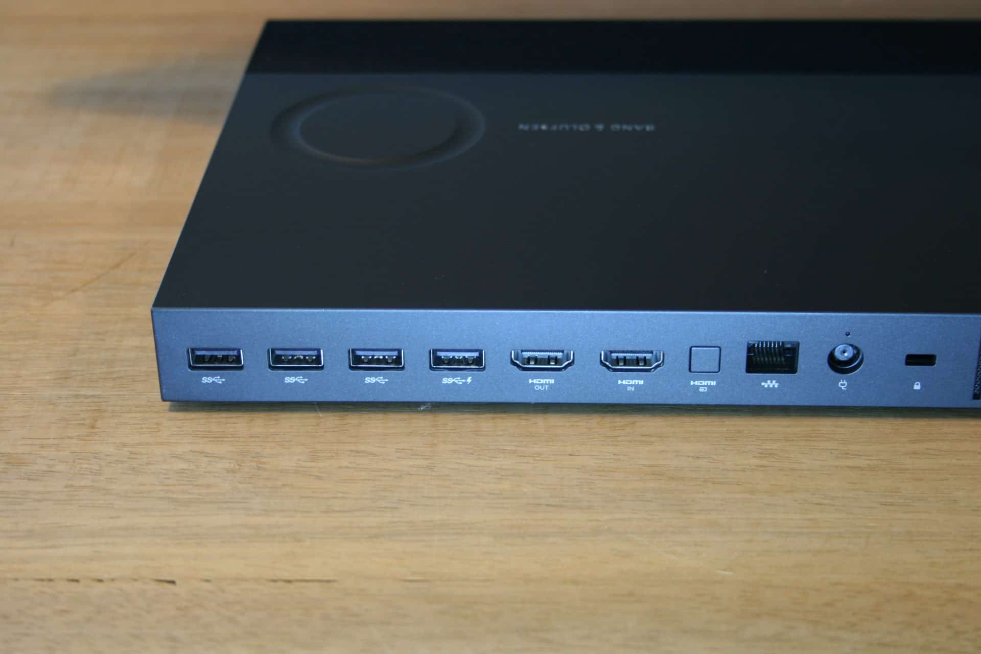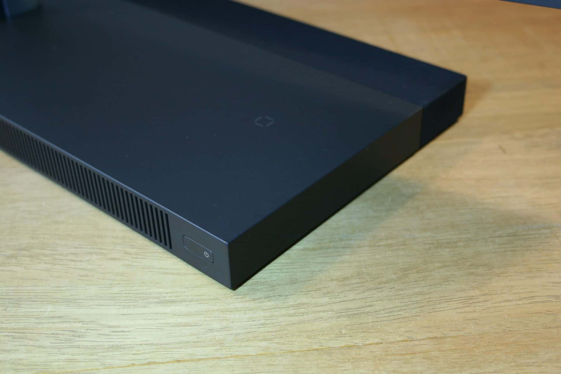 Aan de achterzijde vinden we, vanaf de achterzijde gezien, rechts een mooi vlak geïntegreerde powerbutton, een breed rooster voor de interne koeling, een uitsparing voor een Kensington Lock, aansluiting voor netadapter en een RJ45 netwerkaansluiting. Vervolgens een HDMI 2.0 ingang, een HDMI 2,0 uitgang en een druktoets voor selectie tussen pc en HDMI. Vervolgens een viertal USB-A 3.0 poorten.